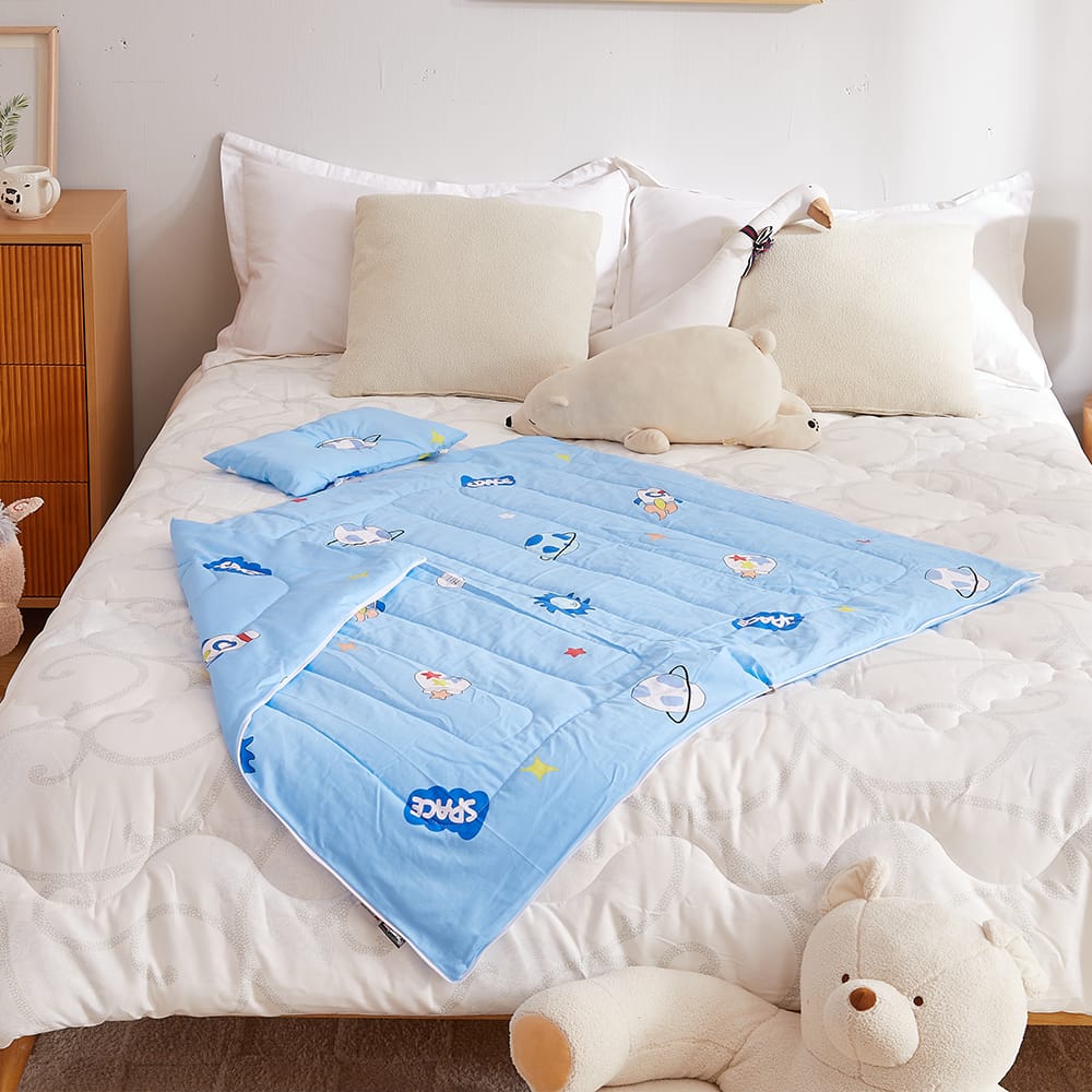 四季可用,多功能一款多用,方便携带,设计靓丽可爱,可做睡袋可做被子,附带小枕头。家里学校车后座及户外露营均可用。高效保暖,安全不致敏,轻松耐水洗,蓬松柔软透气
